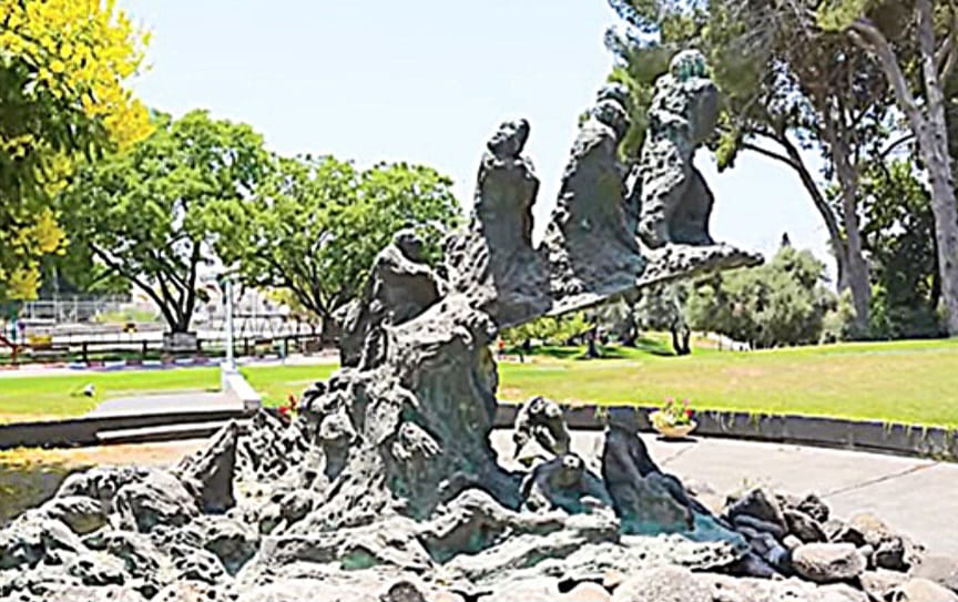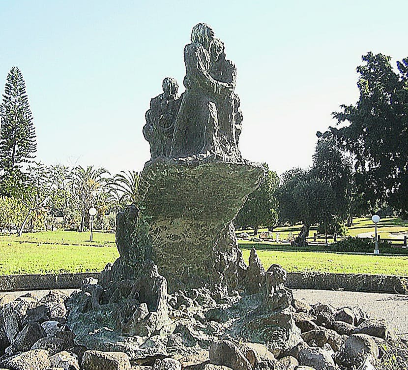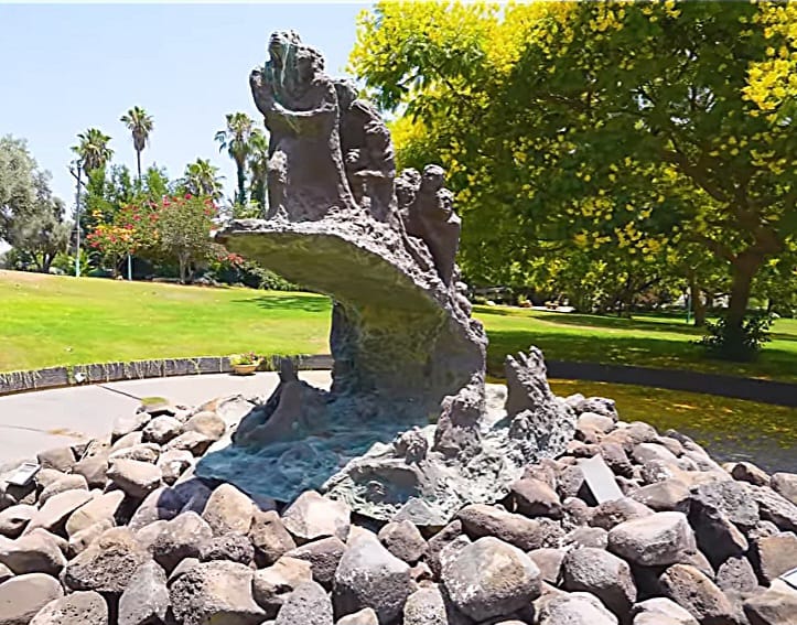 Das von Batia Lishanski kreierte Mahnmal, das im Beisein von David Ben Gurion eingeweiht wurde, zeigt auf der Rückseite (die Vergangenheit symbolisierend) “Trockene Gebeine”, (die für die Shoa Opfer stehen)
